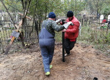 На данном участке изначально присутствовал только простой бетонный памятник и металлическое ограждение. Нам же необходимо было привести территорию могилы в полный порядок. Приступая к работе, мы первым делом вкручиваем определяющие фундамент сваи.