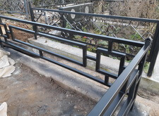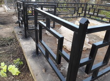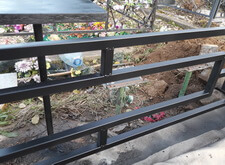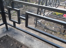 Возвращаемся на могилу. Подготавливаем оградку к покраске, зачищая её от старого покрытия. Параллельно устанавливаем подставку для памятника.