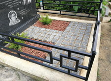 Через некоторое время возвращаемся к могиле. На территорию участка выкладываем брусчатку, оставляя два прямоугольных цветника, в которые сажаем небольшие можжевеловые кусты. В результате получилось качественное наземное покрытие с дорожкой до надгробья. Клиент осталась довольна нами и оставила видеоотзыв.