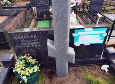 Изначально на месте захоронения находился лишь широкий горизонтальный памятник из чёрного гранита, разделённый на две половины светлым православным крестом. Клиент пожелал выгравировать на пустом пространстве памятник новую надпись, так как на могиле недавно произошло дозахоронение.