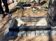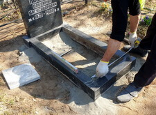 Для гарантии устойчивости памятника ему требовалось придать жёсткость каркаса по периметру. Бетонное основание смотрелось бы непривлекательно, поэтому с согласия клиентки мы решили уложить вокруг памятника один ряд брусчатки. Первым этапом работы был точный замер цветника с надгробьем.